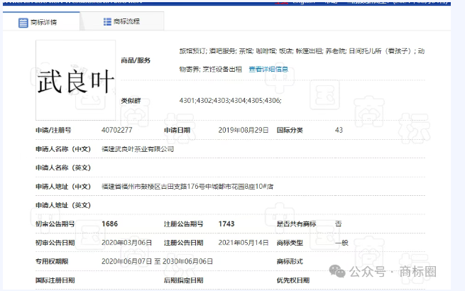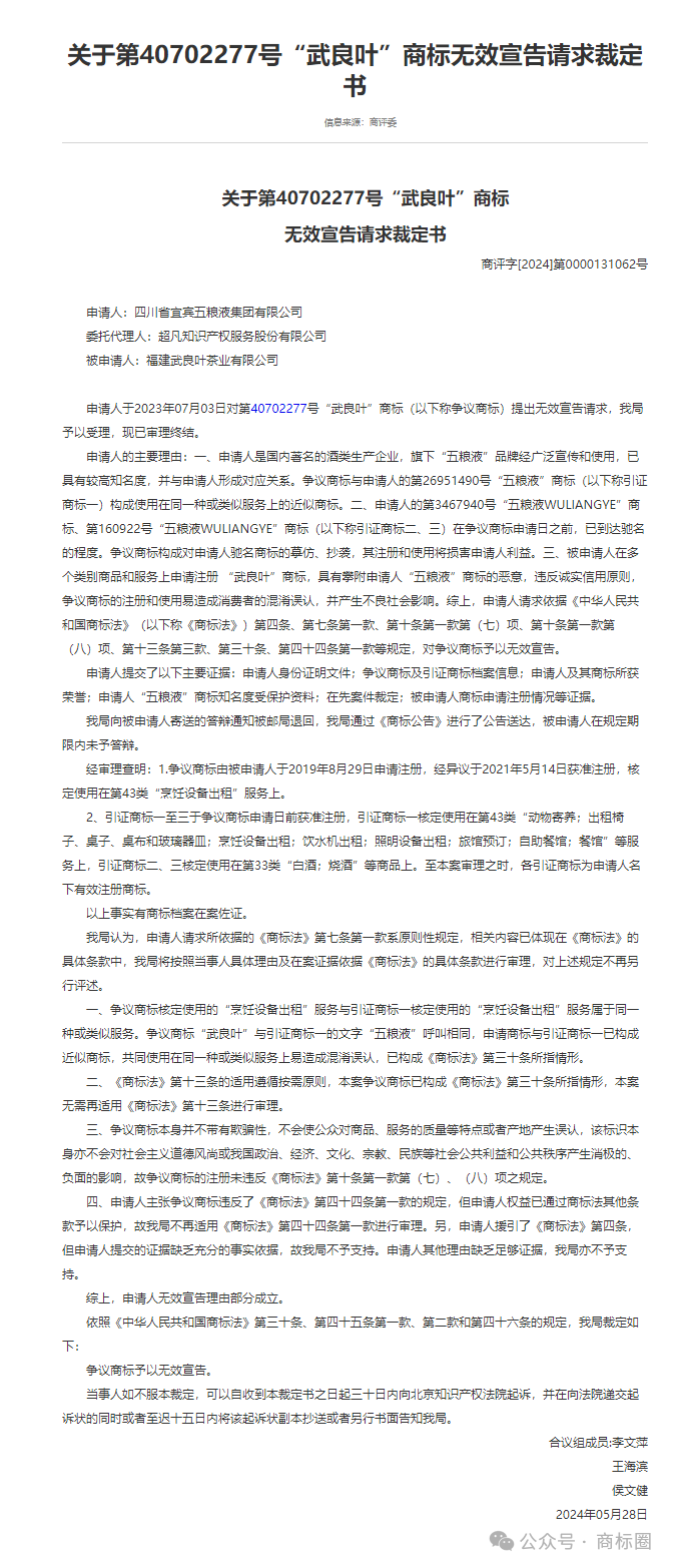 2023年07月03日福建武良叶茶业有限公司注册第40702277号“武良叶”商标,核准类别在43类。商标在异议期被人异议,没有异议成功,反而注册下来被四川省宜宾五粮液集团有限公司无效宣告成功,商标予以无效宣告。