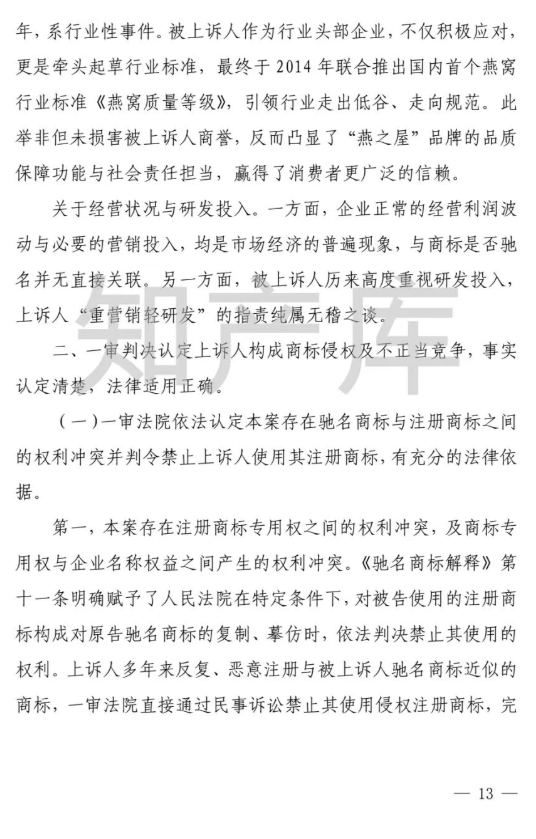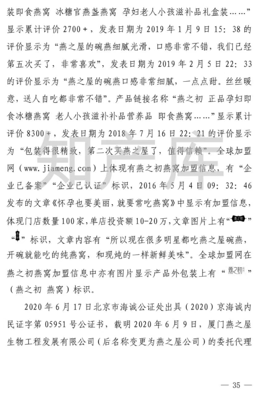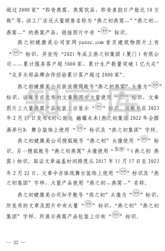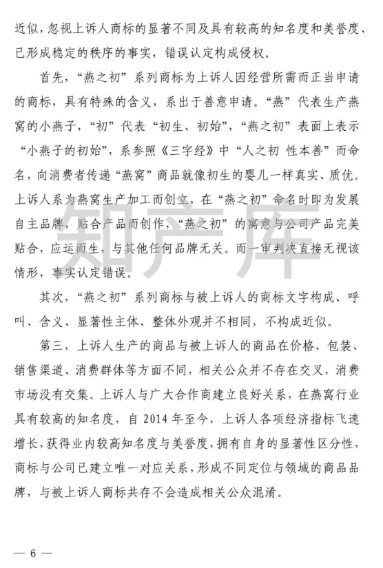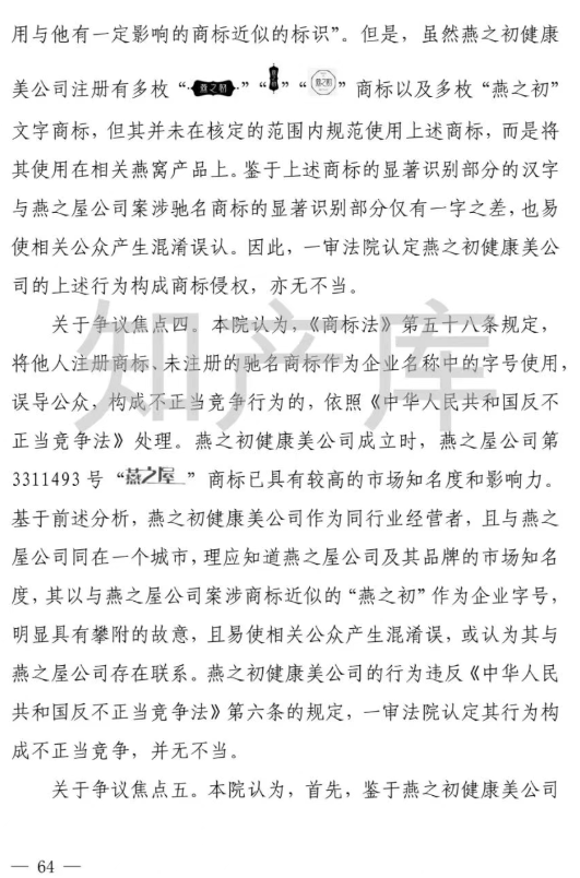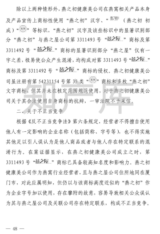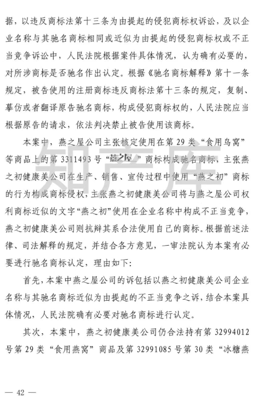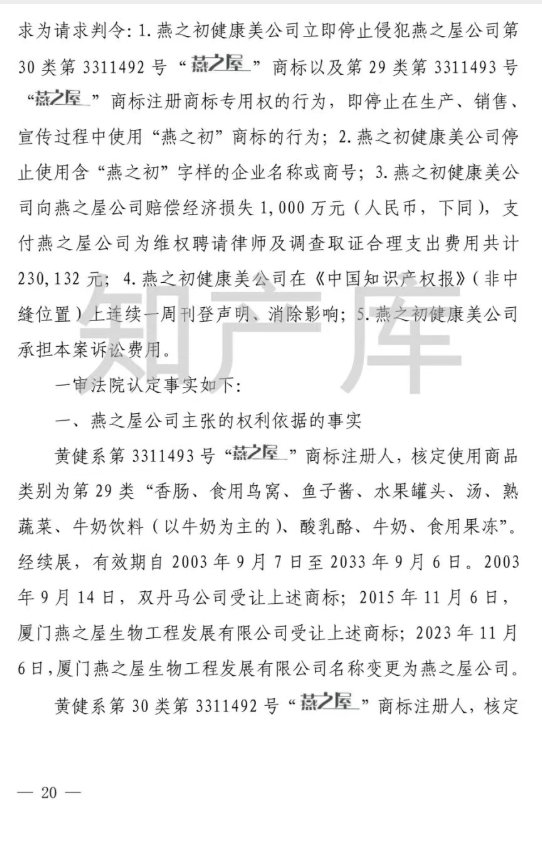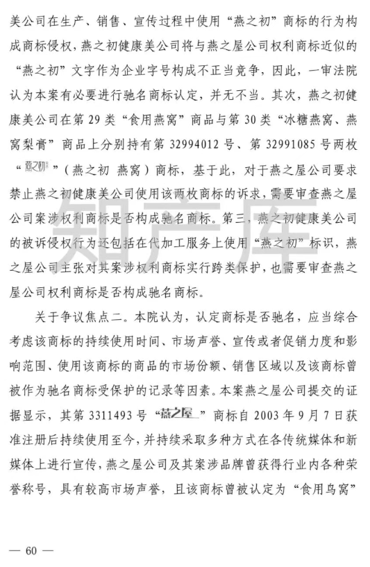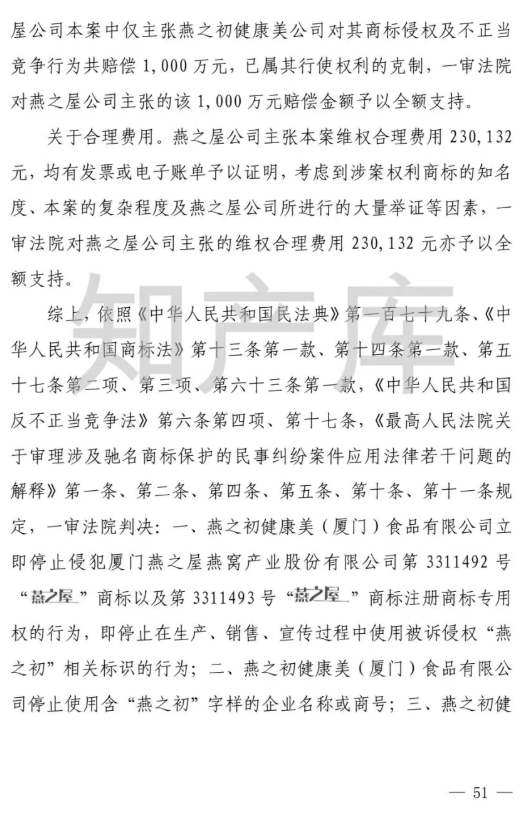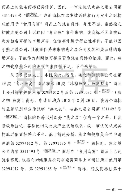 ”诉“燕之初”商标侵权及不正当竞争案,法院认定“燕之屋”为驰名商标,认定“燕之初”构成商标侵权,认定“燕之初”企业字号构成不正当竞争,判赔1000万。