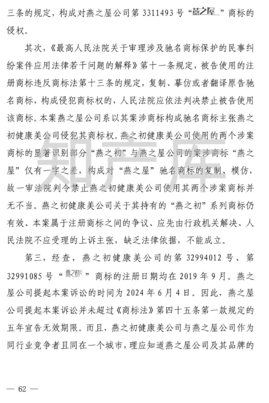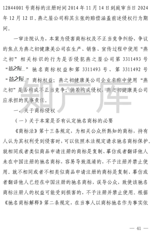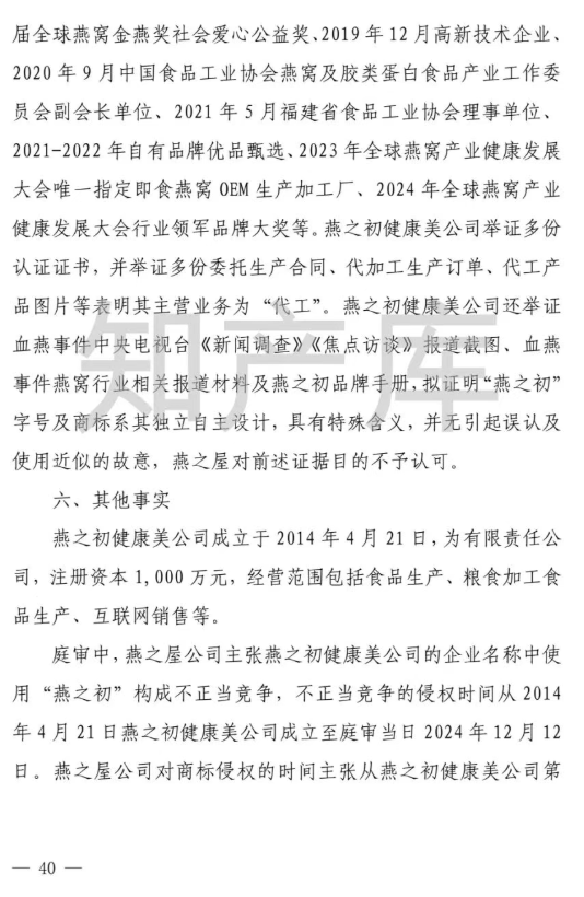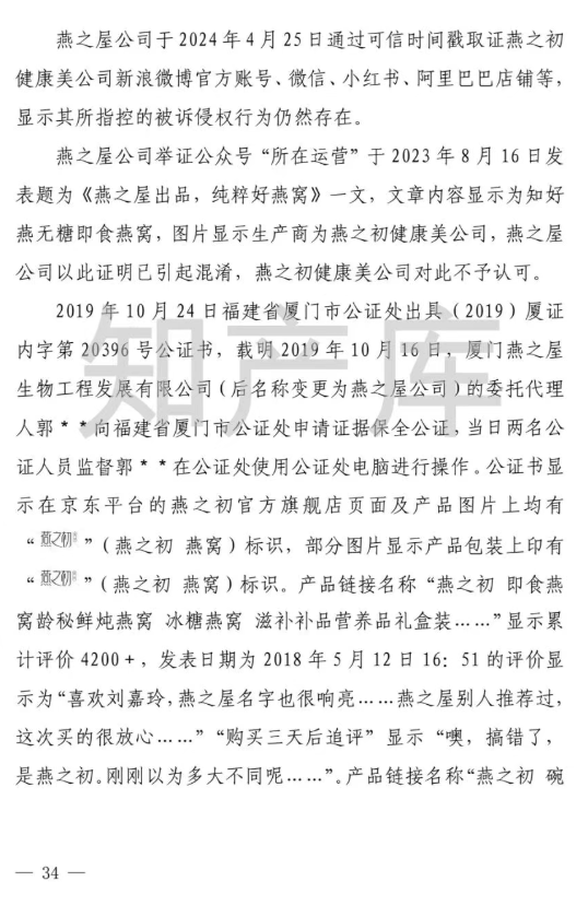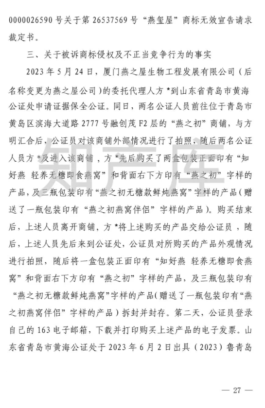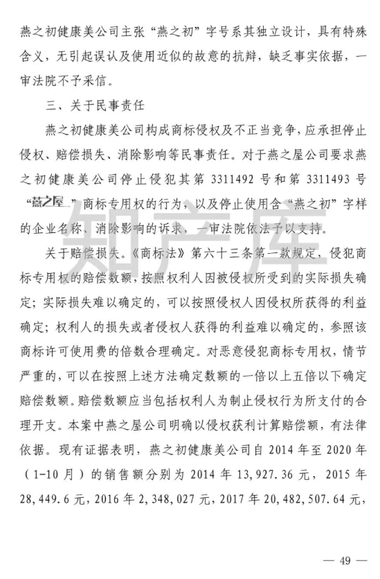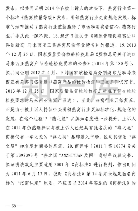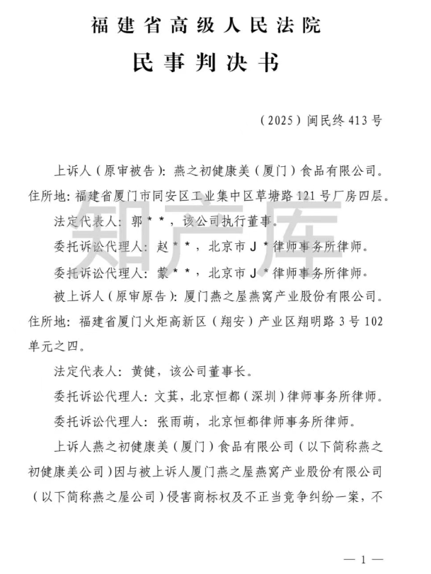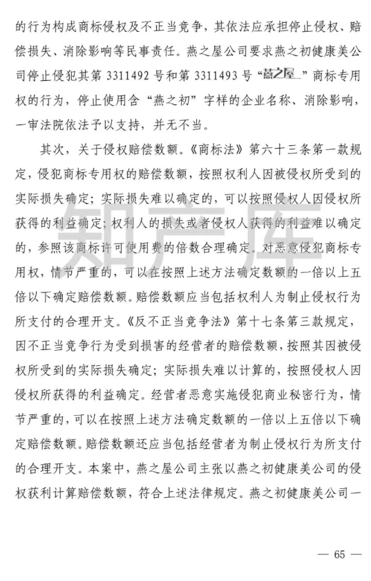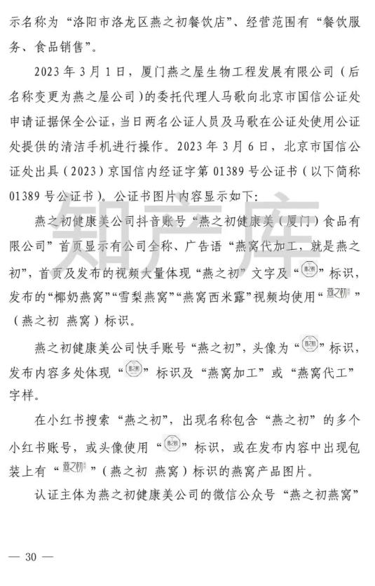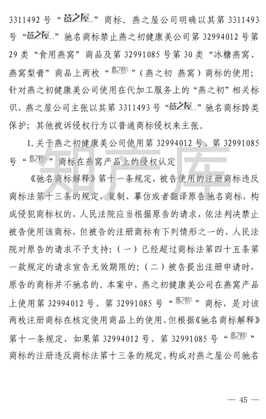 ”诉“燕之初”商标侵权及不正当竞争案,法院认定“燕之屋”为驰名商标,认定“燕之初”构成商标侵权,认定“燕之初”企业字号构成不正当竞争,判赔1000万。