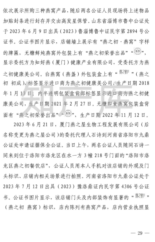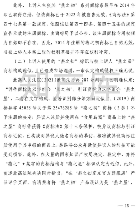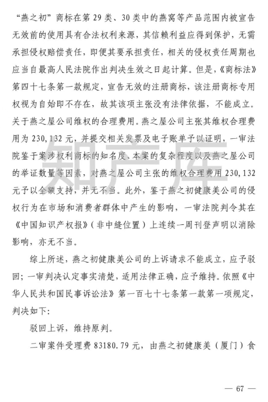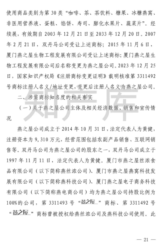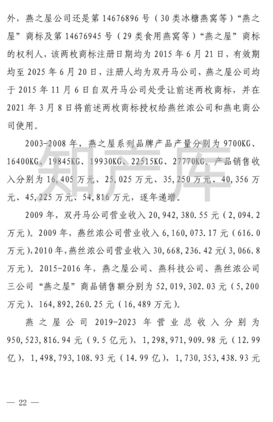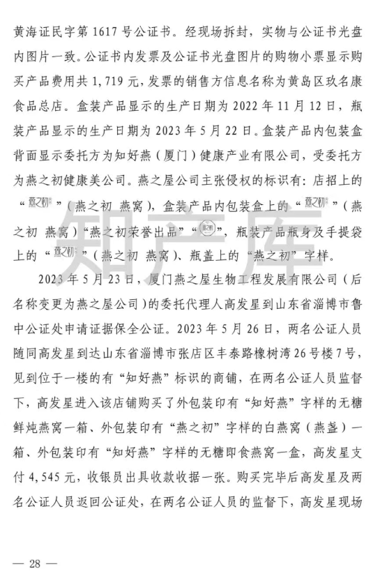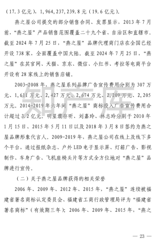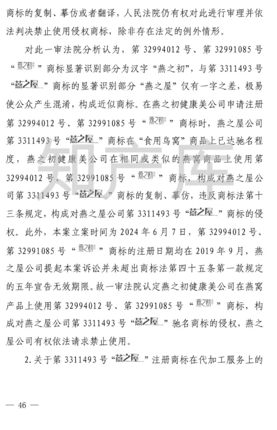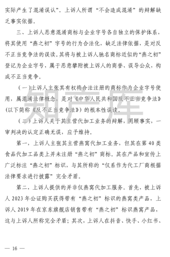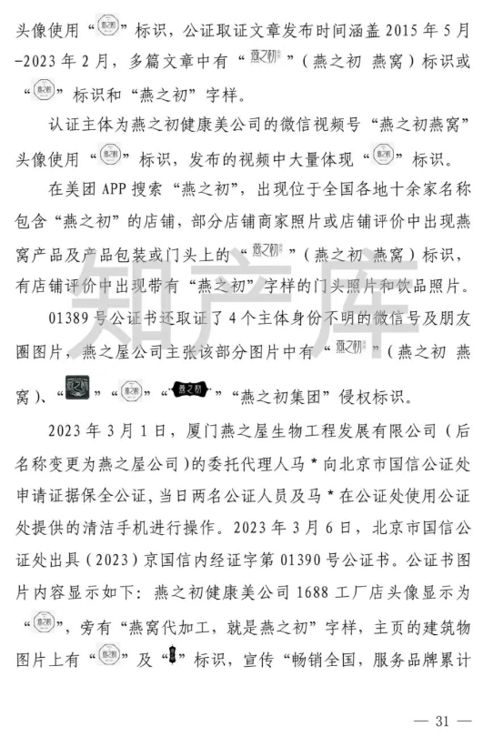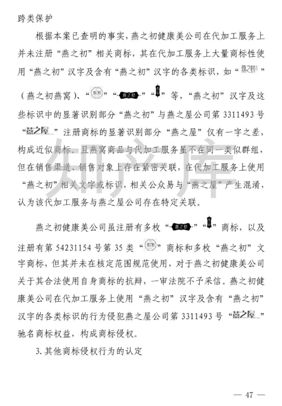 ”诉“燕之初”商标侵权及不正当竞争案,法院认定“燕之屋”为驰名商标,认定“燕之初”构成商标侵权,认定“燕之初”企业字号构成不正当竞争,判赔1000万。