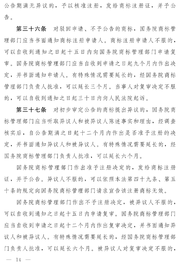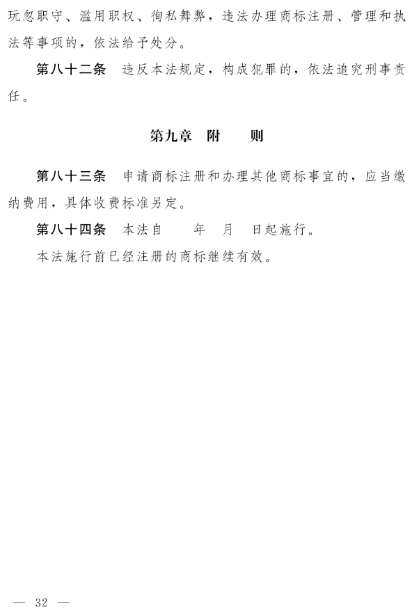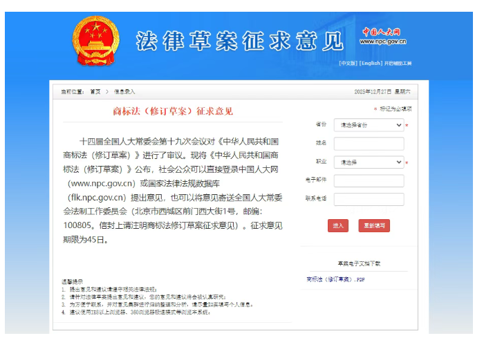 十四届全国人大常委会第十九次会议对《中华人民共和国商标法(修订草案)》进行了审议。现将《中华人民共和国商标法(修订草案)》公布,社会公众可以直接登录中国人大网(www.npc.gov.cn)或国家法律法规数据库(flk.npc.gov.cn)提出意见,也可以将意见寄送全国人大常委会法制工作委员会(北京市西城区前门西大街1号,邮编:100805。信封上请注明商标法修订草案征求意见)。征求意见期限为45日。