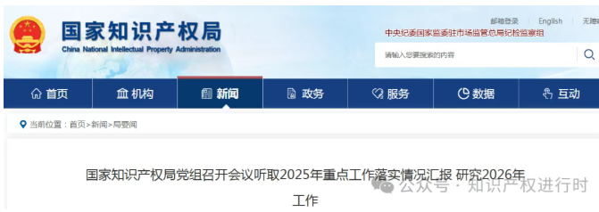 2025年12月30日,国家知识产权局党组召开会议,听取党组2025年重点工作落实情况汇报,研究2026年工作。会议提到全局一年来取得显著成效,提到:四是严把专利、商标审查授权关,持续加强审查能力和信息化建设,审查质量效率进一步提升。