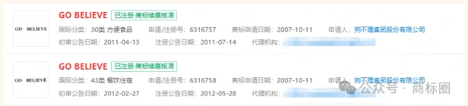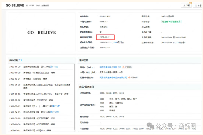 英文名字确认后,天津狗不理集团迅速将“GO BELIEVE”在关键类别上注册为商标,于2007年正式提交,2011年初审公告,专用权期限至2031年。
