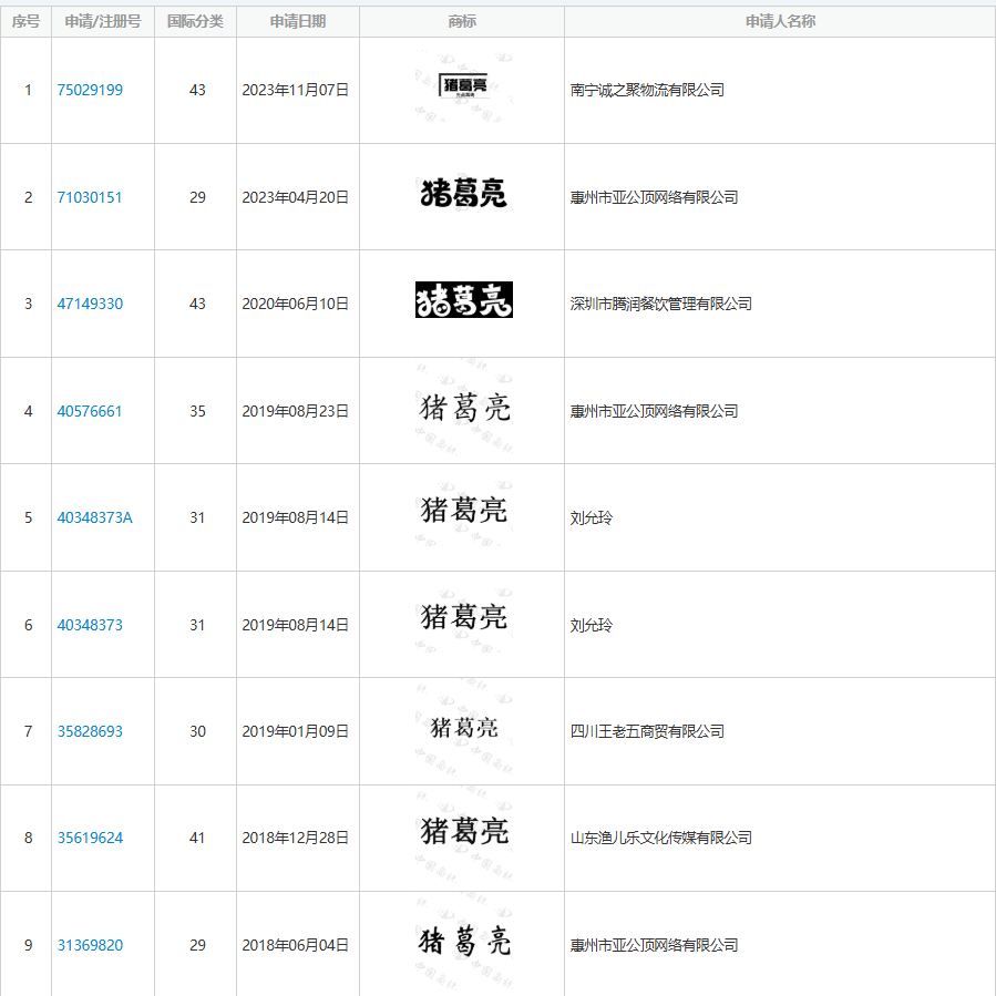 据国家知识产权局网站以及相关信息显示,全国各地有多个商家以“猪葛亮”为商标,涉及餐饮、物流、商贸、文化传媒等多个领域。此次事件,也引发了公众对历史名人形象保护与商业商标注册边界的讨论。