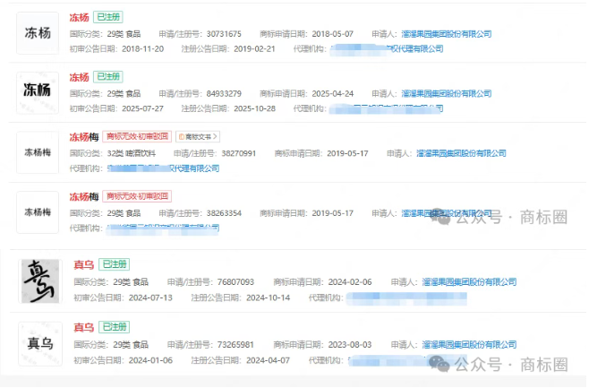 据查询,“冻杨”和“真乌”均由溜溜果园股份有限公司注册,且目前均处于有效状态。其中,“冻杨”商标早在2018年就已申请,核定使用于第29类食品,专用权期限至2029年;“真乌”商标则于2024年申请,同样覆盖食品类别,专用权至2034年。