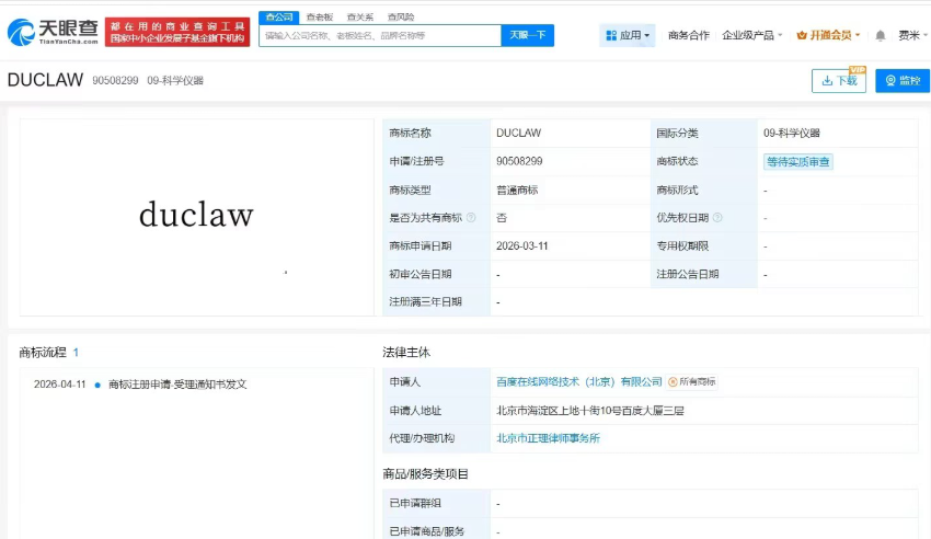 【TechWeb】4月16日消息,天眼查知识产权信息显示,近日,百度在线网络技术(北京)有限公司申请注册“DUCLAW”商标,国际分类为科学仪器,当前商标状态为等待实质审查。