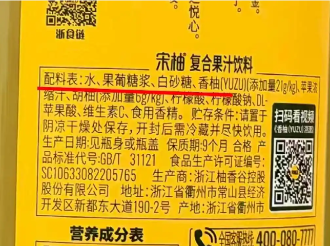 在“宋柚”配料表上,厂家标注香柚、胡柚添加量合计27克/千克,折算下来300克瓶装柚成分仅8.1克,占比只有2.7%。而产品宣称的果汁总含量≥10%,主要依靠苹果浓缩汁等其他果汁凑数,柚汁本身微乎其微。也就是说,消费者喝到的浓郁柚香,真正来源并非原汁,而是食用香精与风味添加剂。