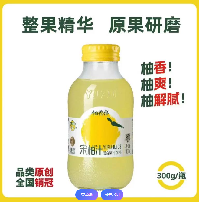 此次,涉事品牌的心机就全用在商标设计上了。他们把“宋柚”注册成商标,产品包装印满柚子图案,广告语三句不离“柚香柚爽柚解腻”,让消费者自然联想这是一款以柚子为主的果汁。