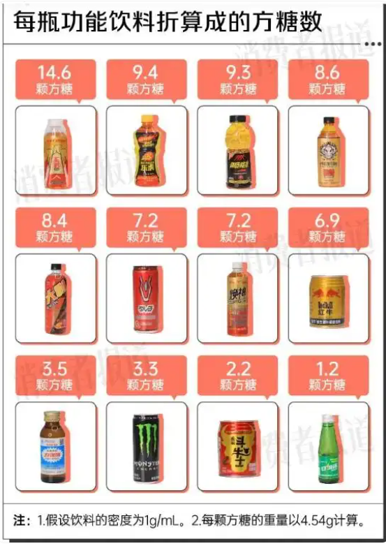 医学数据显示,功能饮料咖啡因含量每罐50至504毫克,而普通成人每日建议摄入量不超过400毫克;每天饮用250毫升,会增加年轻成年人焦虑、抑郁风险。此外,市面功能饮料糖含量最低1.32克/罐、最高37.62克/罐,远超每日25克的建议上限。据《消费者报道》对多个功能饮料测评,最高的1款东鹏特饮每瓶(500mL)含糖量最高(66.5g)更超出最高“警戒线”(50g),喝一瓶相当于摄入14.6颗方糖(每颗方糖以4.54g糖计)。消费者如果有“续杯”需求,或将摄取过量的糖。一瓶东鹏特饮所含糖分已超上限。除此外,记者发现在黑猫投诉等平台,东鹏特饮的维权纠纷也频发:消费者投诉扫码兑奖失败、中免饮瓶盖仍需付费、活动规则标注模糊等。