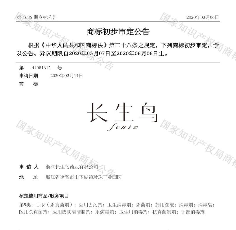 果然,记者随后了解到,这件商标的申请人浙江长生鸟药业有限公司是一家省级疫情防控重点保障企业。为抗击疫情,公司积极响应党和政府号召,将原有的化妆品生产线改为消毒剂生产线。由于消毒剂产品投放市场需要取得商标注册证。2月初,公司人员来到绍兴市商标注册受理窗口,希望加快其用于“卫生消毒剂”等商品上的商标注册受理。 浙江省市场监管局商标处接到这一信息后,第一时间与国家知识产权局商标局对接。商标局根据《疫情防控相关商标注册申请快速审查工作方案》,通过“绿色通道”,加快审理浙江长生鸟药业有限公司在“卫生消毒剂”等商品上申请注册的长生鸟商标,并于3月6日初审公告。据公司负责人介绍,目前企业复工率达97%,日产量可达50吨。需要注意的是,此前有自媒体发表文章称长生鸟商标只用了13天就被核准,其实并不准确哦。