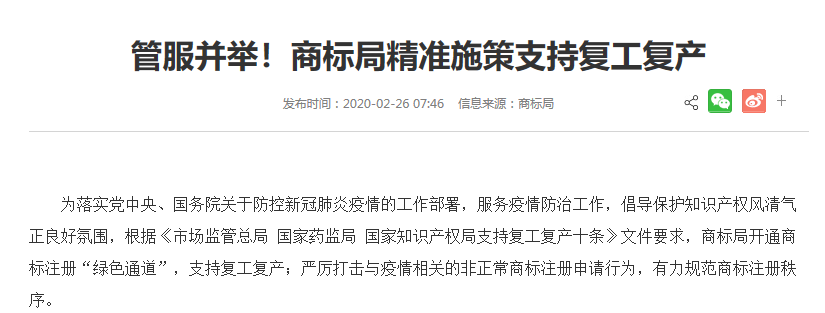 这是什么神操作?明明同期公告的商标都是2019年9月-11月申请的(当然这个速度也是够快了哈)。然后,看到核定使用商品为第五类“卫生消毒剂”等商品后,中国市场监管报记者想到商标局官网曾经发布《管服并举!商标局精准施策支持复工复产》一文,其中提到“开通商标注册‘绿色通道’,支持复工复产”,估计这件商标与此有关……