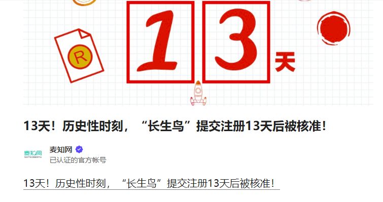 3月6日,商标局官方网站发布了第1686期商标公告。其中第44081612号商标引起了关注。公告信息显示,这件长生鸟商标申请时间为2月14日,也就是说,从申请到公告仅用了20天!