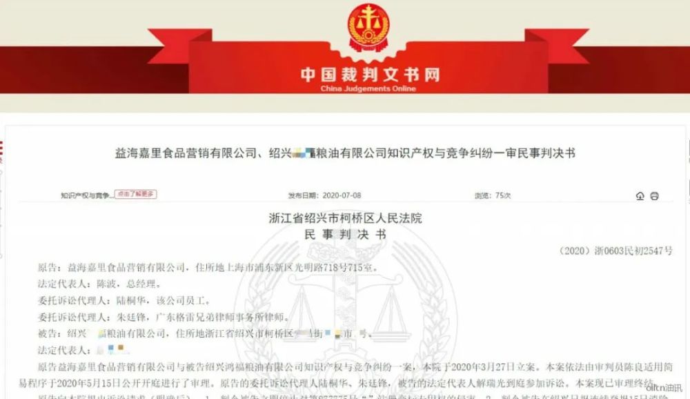 近日,中国裁判文书网公布一起知识产权纠纷案件,被告绍兴**粮油有限公司将与原告益海嘉里食品营销有限公司所有商标相似的标识使用在相同类型产品的外包装上。法院作出一审判决,判令被告赔偿原告10万元。