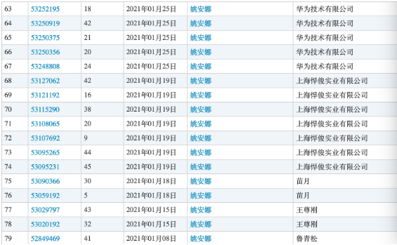 而自2021年1月15日起,“姚安娜”商标申请出现井喷,短短两个月已有78件,其中,除华为公司于1月25日申请了29件“姚安娜”商标,一家名为浙江和孚日化有限公司的公司申请了21个“姚安娜”商标。