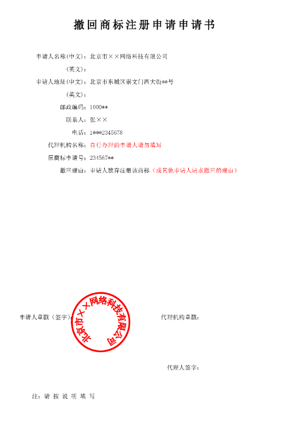 3.填写要求详见《撤回商标注册申请申请书》所附填写说明。