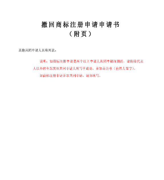 (三)撤回共同申请商标注册的,需由代表人提出申请。申请人名称及申请人地址填写代表人的名称和地址,其他共同申请人的名称依次填写在申请书附页上,并加盖申请人章戳或由申请人本人签字。非共同申请商标注册的,不需提交附页。