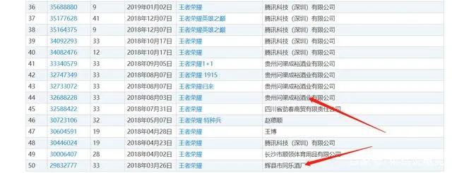 2018年,贵州问渠成裕酒业有限公司还申请注册了多个带有“王者荣耀”、“王者”或“荣耀”字样的商标,其法定代表人还同时担任贵州王者荣耀酒业有限公司的法定代表人。