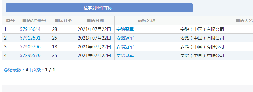 据天淘标网查询显示,近日,安踏(中国)有限公司2021年7月22日申请注册多个“安踏冠军”商标,国际分类涉及健身器材、服装鞋帽、广告销售等,当前商标状态为申请中。